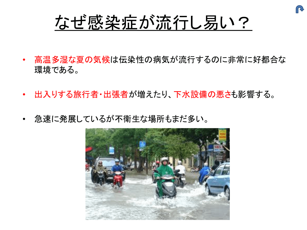 #38. なぜ感染症が流行し易い? • 高温多湿な夏の気候は伝染性の病気が流行するのに非常に好都合な 環境である。 • 出入りする旅行者・出張者が増えたり、下水設備の悪さも影響する。 • 急速に発展しているが不衛生な場所もまだ多い。