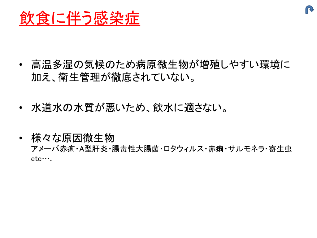 #39. 飲食に伴う感染症 • 高温多湿の気候のため病原微生物が増殖しやすい環境に 加え、衛生管理が徹底されていない。 • 水道水の水質が悪いため、飲水に適さない。 • 様々な原因微生物 アメーバ赤痢・A型肝炎・腸毒性大腸菌・ロタウィルス・赤痢・サルモネラ・寄生虫 etc…..