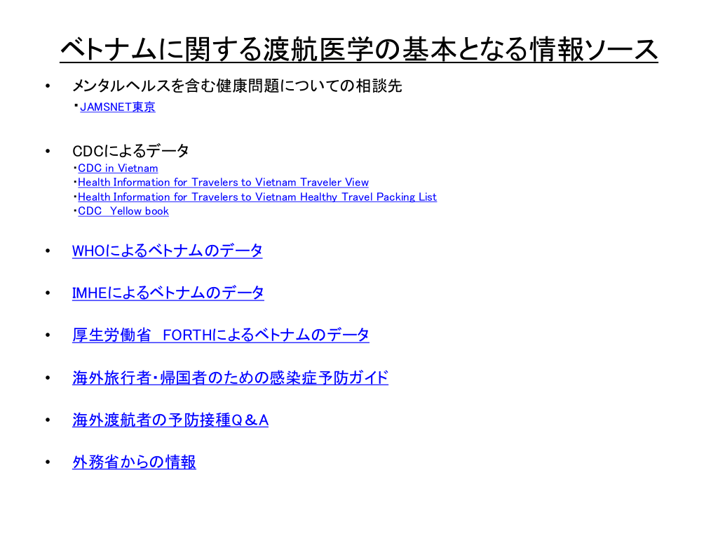 #4. ベトナムに関する渡航医学の基本となる情報ソース • メンタルヘルスを含む健康問題についての相談先 ・JAMSNET東京 • CDCによるデータ ・CDC in Vietnam ・Health Information for Travelers to Vietnam Traveler View ・Health Information for Travelers to Vietnam Healthy Travel Packing List ・CDC Yellow book • WHOによるベトナムのデータ • IMHEによるベトナムのデータ • 厚生労働省 FORTHによるベトナムのデータ • 海外旅行者・帰国者のための感染症予防ガイド • 海外渡航者の予防接種Q&A • 外務省からの情報