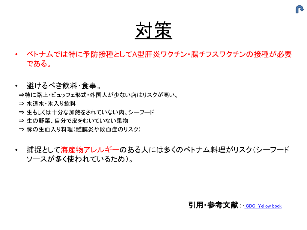 #40. 対策 • ベトナムでは特に予防接種としてA型肝炎ワクチン・腸チフスワクチンの接種が必要 である。 • 避けるべき飲料・食事。 ⇒特に路上・ビュッフェ形式・外国人が少ない店はリスクが高い。 ⇒ 水道水・氷入り飲料 ⇒ 生もしくは十分な加熱をされていない肉、シーフード ⇒ 生の野菜、自分で皮をむいていない果物 ⇒ 豚の生血入り料理(髄膜炎や敗血症のリスク) • 捕捉として海産物アレルギーのある人には多くのベトナム料理がリスク(シーフード ソースが多く使われているため)。 引用・参考文献:・ CDC Yellow book
