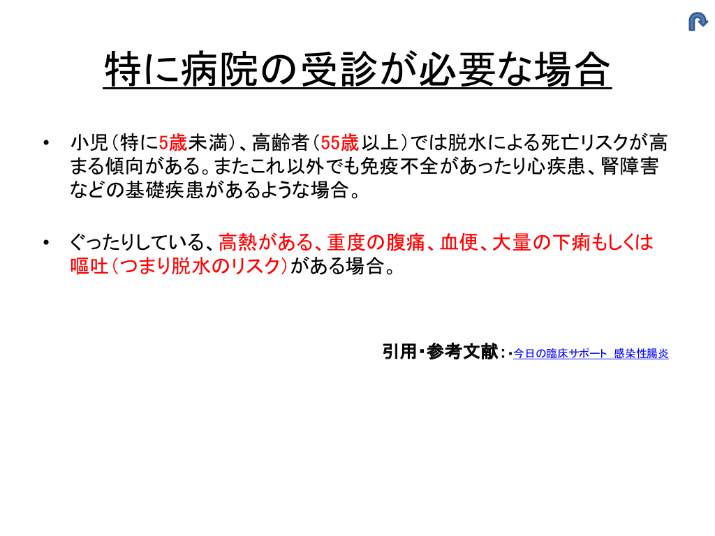#41. 特に病院の受診が必要な場合 • 小児(特に5歳未満)、高齢者(55歳以上)では脱水による死亡リスクが高 まる傾向がある。またこれ以外でも免疫不全があったり心疾患、腎障害 などの基礎疾患があるような場合。 • ぐったりしている、高熱がある、重度の腹痛、血便、大量の下痢もしくは 嘔吐(つまり脱水のリスク)がある場合。 引用・参考文献:・今日の臨床サポート 感染性腸炎