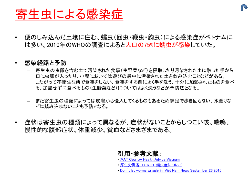 #42. 寄生虫による感染症 • 便のしみ込んだ土壌に住む、蠕虫(回虫・鞭虫・鉤虫)による感染症がベトナムに は多い。2010年のWHOの調査によると人口の75%に蠕虫が感染していた。 • 感染経路と予防 • – 寄生虫の虫卵を含む土で汚染された食事(生野菜など)を摂取したり汚染された土に触った手から 口に虫卵が入ったり、小児においては遊びの最中に汚染された土を飲み込むことなどがある。 したがって不衛生な所で食事をしない、食事をする前によく手を洗う、十分に加熱されたものを食べ る、加熱せずに食べるもの(生野菜など)についてはよく洗うなどが予防法となる。 – また寄生虫の種類によっては皮膚から侵入してくるものもあるため裸足で歩き回らない、水溜りな どに踏み込まないことも予防となる。 症状は寄生虫の種類によって異なるが、症状がないことからしつこい咳、喘鳴、 慢性的な腹部症状、体重減少、貧血などさまざまである。 引用・参考文献: ・IMAT Country Health Advice Vietnam • 厚生労働省 FORTH 蠕虫症について • Don’t let worms wriggle in; Viet Nam News September 26 2016
