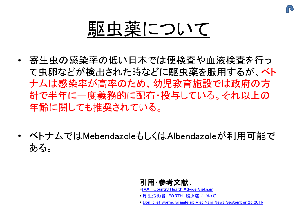 #43. 駆虫薬について • 寄生虫の感染率の低い日本では便検査や血液検査を行っ て虫卵などが検出された時などに駆虫薬を服用するが、ベト ナムは感染率が高率のため、幼児教育施設では政府の方 針で半年に一度義務的に配布・投与している。それ以上の 年齢に関しても推奨されている。 • ベトナムではMebendazoleもしくはAlbendazoleが利用可能で ある。 引用・参考文献: ・IMAT Country Health Advice Vietnam • 厚生労働省 FORTH 蠕虫症について • Don’t let worms wriggle in; Viet Nam News September 26 2016