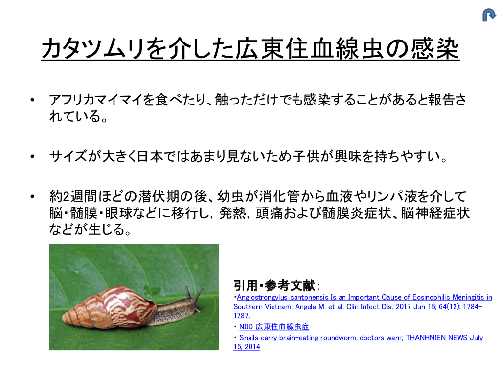 #44. カタツムリを介した広東住血線虫の感染 • アフリカマイマイを食べたり、触っただけでも感染することがあると報告さ れている。 • サイズが大きく日本ではあまり見ないため子供が興味を持ちやすい。 • 約2週間ほどの潜伏期の後、幼虫が消化管から血液やリンパ液を介して 脳・髄膜・眼球などに移行し,発熱,頭痛および髄膜炎症状、脳神経症状 などが生じる。 引用・参考文献: ・Angiostrongylus cantonensis Is an Important Cause of Eosinophilic Meningitis in Southern Vietnam; Angela M. et al. Clin Infect Dis. 2017 Jun 15; 64(12): 1784– 1787. ・ NIID 広東住血線虫症 ・ Snails carry brain-eating roundworm, doctors warn; THANHNIEN NEWS July 15, 2014