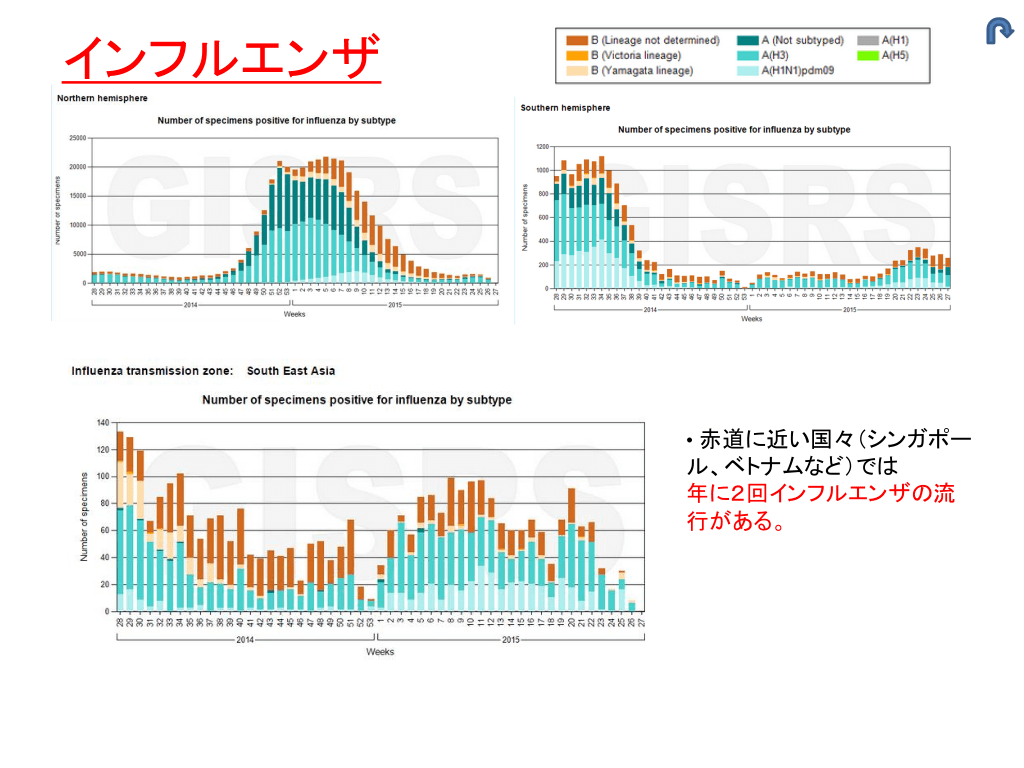 #45. インフルエンザ • 赤道に近い国々(シンガポー ル、ベトナムなど)では 年に2回インフルエンザの流 行がある。