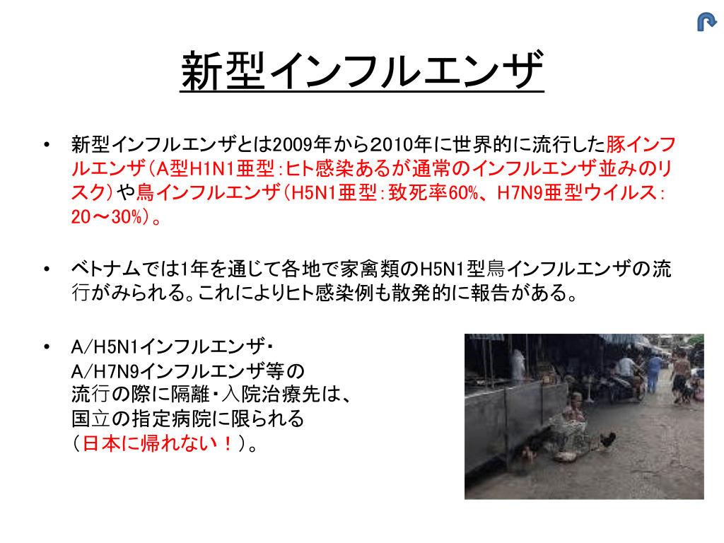 #46. 新型インフルエンザ • 新型インフルエンザとは2009年から2010年に世界的に流行した豚インフ ルエンザ(A型H1N1亜型:ヒト感染あるが通常のインフルエンザ並みのリ スク)や鳥インフルエンザ(H5N1亜型:致死率60%、 H7N9亜型ウイルス: 20~30%)。 • ベトナムでは1年を通じて各地で家禽類のH5N1型⿃インフルエンザの流 ⾏がみられる。これによりヒト感染例も散発的に報告がある。 • A/H5N1インフルエンザ・ A/H7N9インフルエンザ等の 流⾏の際に隔離・⼊院治療先は、 国⽴の指定病院に限られる (日本に帰れない!)。
