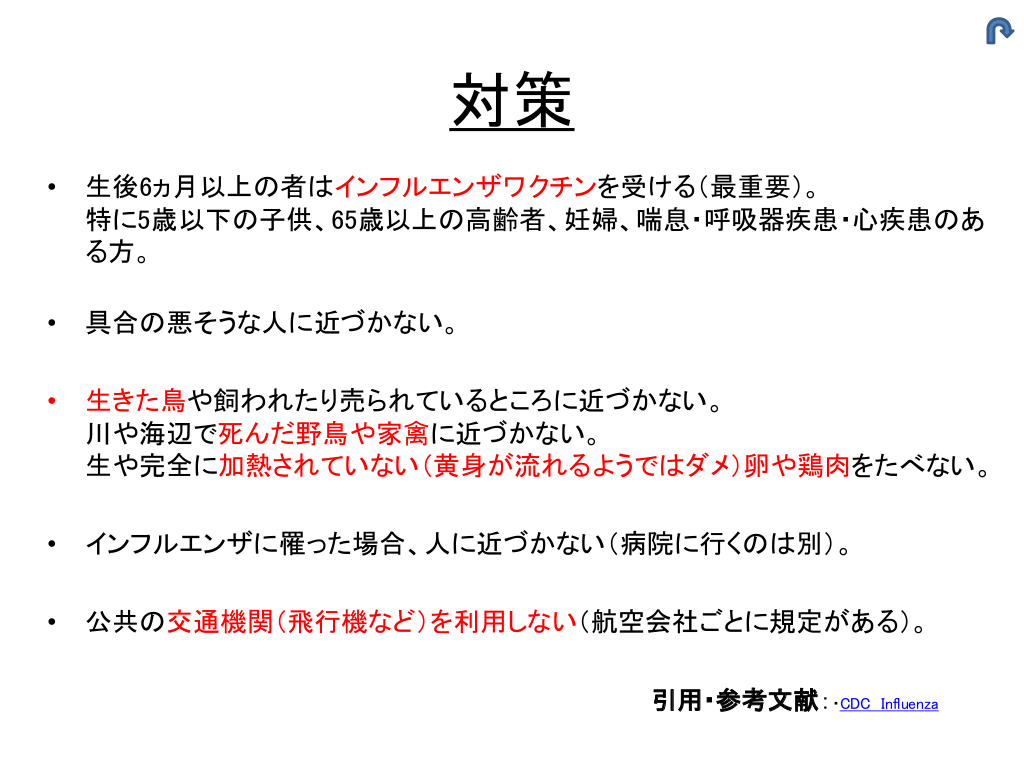 #48. 対策 • 生後6ヵ月以上の者はインフルエンザワクチンを受ける(最重要)。 特に5歳以下の子供、65歳以上の高齢者、妊婦、喘息・呼吸器疾患・心疾患のあ る方。 • 具合の悪そうな人に近づかない。 • 生きた鳥や飼われたり売られているところに近づかない。 川や海辺で死んだ野鳥や家禽に近づかない。 生や完全に加熱されていない(黄身が流れるようではダメ)卵や鶏肉をたべない。 • インフルエンザに罹った場合、人に近づかない(病院に行くのは別)。 • 公共の交通機関(飛行機など)を利用しない(航空会社ごとに規定がある)。 引用・参考文献:・CDC Influenza
