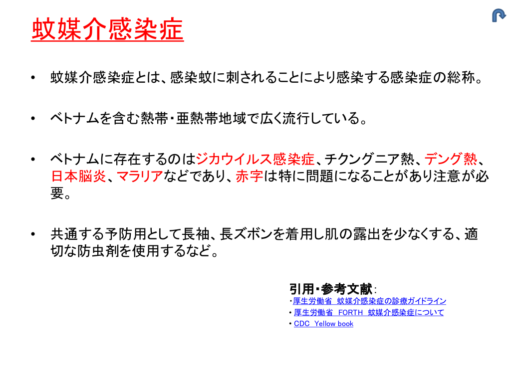 #49. 蚊媒介感染症 • 蚊媒介感染症とは、感染蚊に刺されることにより感染する感染症の総称。 • ベトナムを含む熱帯・亜熱帯地域で広く流行している。 • ベトナムに存在するのはジカウイルス感染症、チクングニア熱、デング熱、 日本脳炎、マラリアなどであり、赤字は特に問題になることがあり注意が必 要。 • 共通する予防用として長袖、長ズボンを着用し肌の露出を少なくする、適 切な防虫剤を使用するなど。 引用・参考文献: ・厚生労働省 蚊媒介感染症の診療ガイドライン • 厚生労働省 FORTH 蚊媒介感染症について • CDC Yellow book