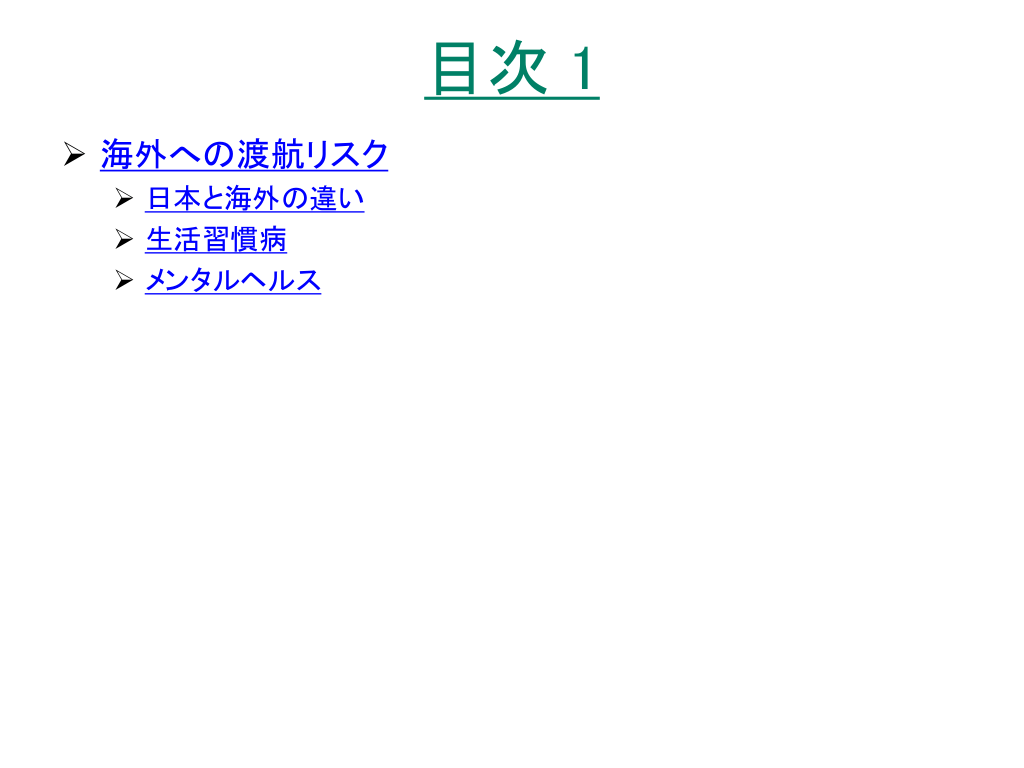 #5. 目次 1 ➢ 海外への渡航リスク ➢ 日本と海外の違い ➢ 生活習慣病 ➢ メンタルヘルス