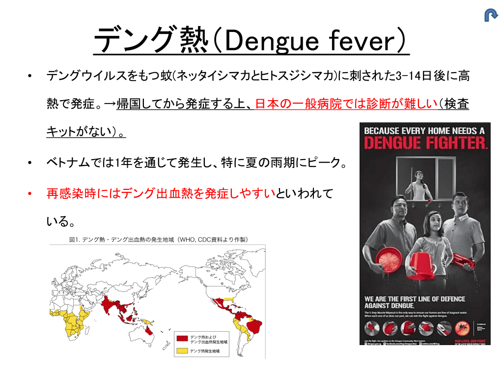 #50. デング熱(Dengue fever) • デングウイルスをもつ蚊(ネッタイシマカとヒトスジシマカ)に刺された3-14日後に高 熱で発症。→帰国してから発症する上、日本の一般病院では診断が難しい(検査 キットがない)。 • ベトナムでは1年を通じて発生し、特に夏の雨期にピーク。 • 再感染時にはデング出血熱を発症しやすいといわれて いる。