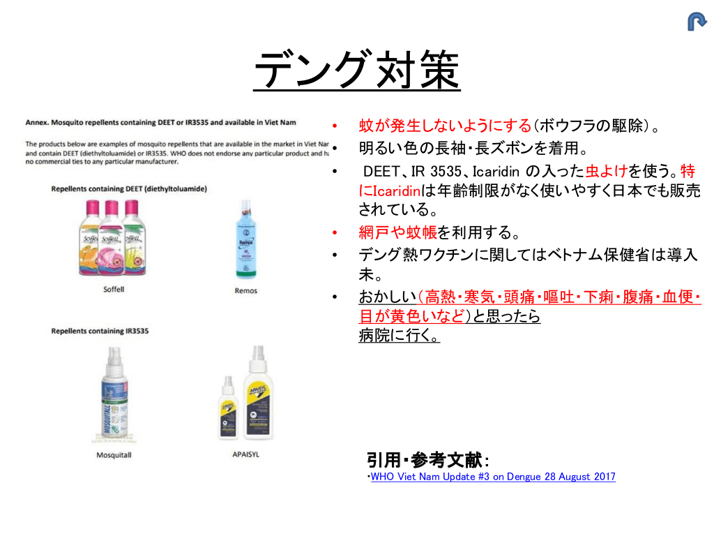 #51. デング対策 • • • • • • 蚊が発生しないようにする(ボウフラの駆除)。 明るい色の長袖・長ズボンを着用。 DEET、IR 3535、Icaridin の入った虫よけを使う。特 にIcaridinは年齢制限がなく使いやすく日本でも販売 されている。 網戸や蚊帳を利用する。 デング熱ワクチンに関してはベトナム保健省は導入 未。 おかしい(高熱・寒気・頭痛・嘔吐・下痢・腹痛・血便・ 目が黄色いなど)と思ったら 病院に行く。 引用・参考文献: ・WHO Viet Nam Update #3 on Dengue 28 August 2017