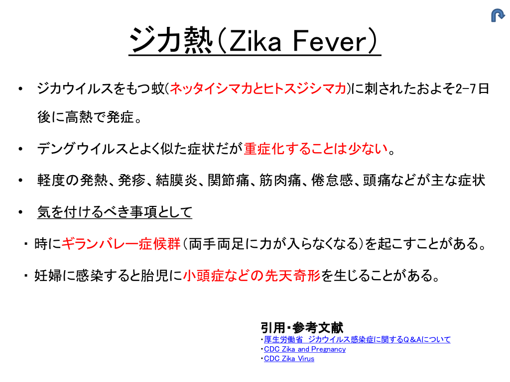 #52. ジカ熱(Zika Fever) • ジカウイルスをもつ蚊(ネッタイシマカとヒトスジシマカ)に刺されたおよそ2-7日 後に高熱で発症。 • デングウイルスとよく似た症状だが重症化することは少ない。 • 軽度の発熱、発疹、結膜炎、関節痛、筋肉痛、倦怠感、頭痛などが主な症状 • 気を付けるべき事項として ・ 時にギランバレー症候群(両手両足に力が入らなくなる)を起こすことがある。 ・ 妊婦に感染すると胎児に小頭症などの先天奇形を生じることがある。 引用・参考文献 ・厚生労働省 ジカウイルス感染症に関するQ&Aについて ・CDC Zika and Pregnancy ・CDC Zika Virus