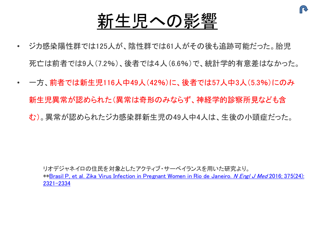 #53. 新生児への影響 • ジカ感染陽性群では125人が、陰性群では61人がその後も追跡可能だった。胎児 死亡は前者では9人(7.2%)、後者では4人(6.6%)で、統計学的有意差はなかった。 • 一方、前者では新生児116人中49人(42%)に、後者では57人中3人(5.3%)にのみ 新生児異常が認められた(異常は奇形のみならず、神経学的診察所見なども含 む)。異常が認められたジカ感染群新生児の49人中4人は、生後の小頭症だった。 リオデジャネイロの住民を対象としたアクティブ・サーベイランスを用いた研究より。 **Brasil P, et al. Zika Virus Infection in Pregnant Women in Rio de Janeiro. N Engl J Med 2016; 375(24): 2321-2334