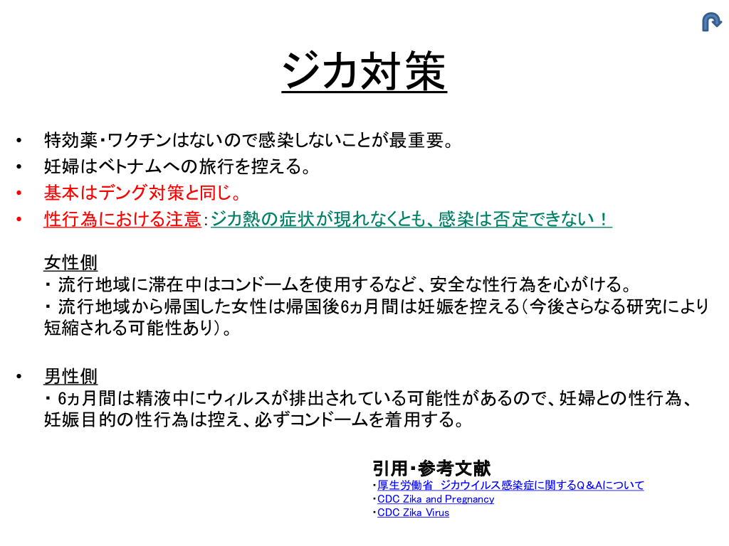 #54. ジカ対策 • • • • 特効薬・ワクチンはないので感染しないことが最重要。 妊婦はベトナムへの旅行を控える。 基本はデング対策と同じ。 性行為における注意:ジカ熱の症状が現れなくとも、感染は否定できない! 女性側 ・ 流行地域に滞在中はコンドームを使用するなど、安全な性行為を心がける。 ・ 流行地域から帰国した女性は帰国後6ヵ月間は妊娠を控える(今後さらなる研究により 短縮される可能性あり)。 • 男性側 ・ 6ヵ月間は精液中にウィルスが排出されている可能性があるので、妊婦との性行為、 妊娠目的の性行為は控え、必ずコンドームを着用する。 引用・参考文献 ・厚生労働省 ジカウイルス感染症に関するQ&Aについて ・CDC Zika and Pregnancy ・CDC Zika Virus