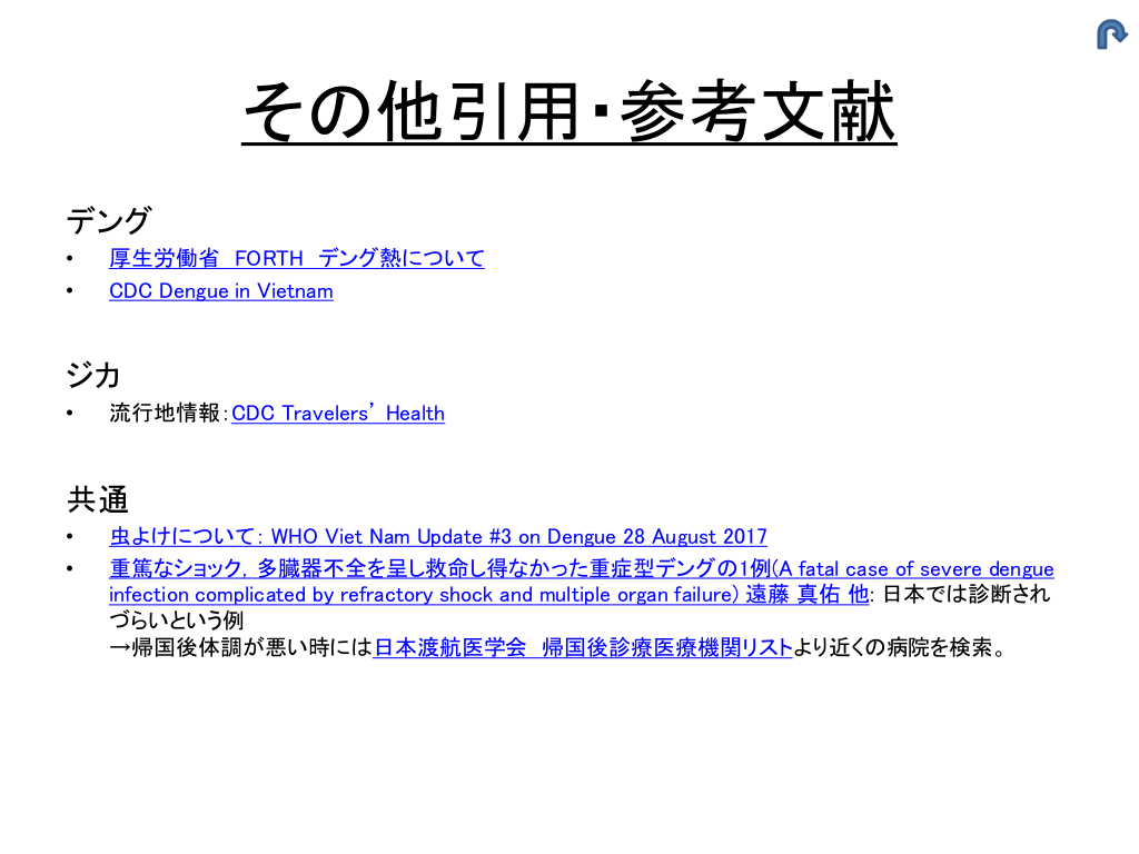 #55. その他引用・参考文献 デング • • 厚生労働省 FORTH デング熱について CDC Dengue in Vietnam ジカ • 流行地情報:CDC Travelers’ Health 共通 • • 虫よけについて: WHO Viet Nam Update #3 on Dengue 28 August 2017 重篤なショック,多臓器不全を呈し救命し得なかった重症型デングの1例(A fatal case of severe dengue infection complicated by refractory shock and multiple organ failure) 遠藤 真佑 他: 日本では診断され づらいという例 →帰国後体調が悪い時には日本渡航医学会 帰国後診療医療機関リストより近くの病院を検索。