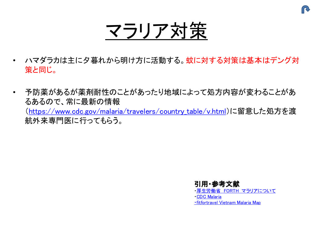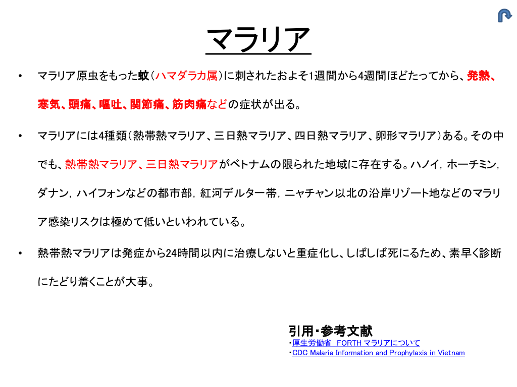#56. マラリア • マラリア原虫をもった蚊(ハマダラカ属)に刺されたおよそ1週間から4週間ほどたってから、発熱、 寒気、頭痛、嘔吐、関節痛、筋肉痛などの症状が出る。 • マラリアには4種類(熱帯熱マラリア、三日熱マラリア、四日熱マラリア、卵形マラリア)ある。その中 でも、熱帯熱マラリア、三日熱マラリアがベトナムの限られた地域に存在する。ハノイ,ホーチミン, ダナン,ハイフォンなどの都市部,紅河デルタ一帯,ニャチャン以北の沿岸リゾート地などのマラリ ア感染リスクは極めて低いといわれている。 • 熱帯熱マラリアは発症から24時間以内に治療しないと重症化し、しばしば死にるため、素早く診断 にたどり着くことが大事。 引用・参考文献 ・厚生労働省 FORTH マラリアについて ・CDC Malaria Information and Prophylaxis in Vietnam