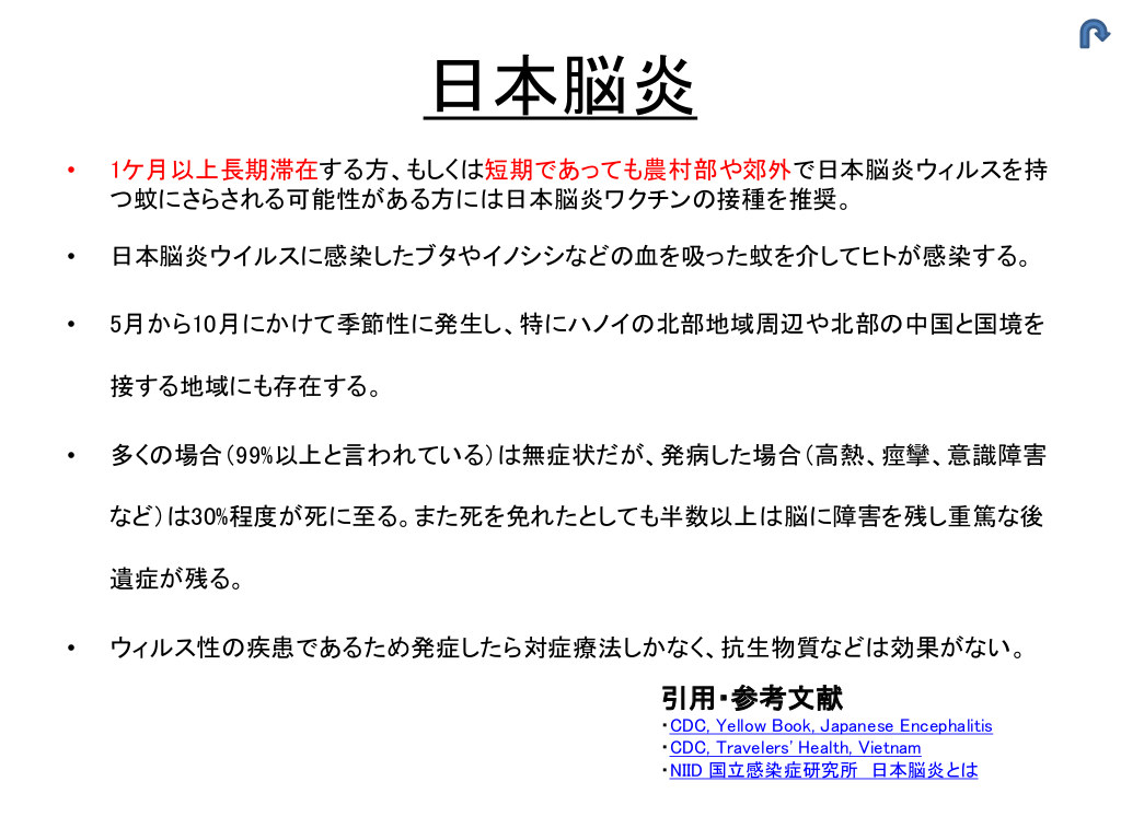 #58. 日本脳炎 • 1ケ月以上長期滞在する方、もしくは短期であっても農村部や郊外で日本脳炎ウィルスを持 つ蚊にさらされる可能性がある方には日本脳炎ワクチンの接種を推奨。 • 日本脳炎ウイルスに感染したブタやイノシシなどの血を吸った蚊を介してヒトが感染する。 • 5月から10月にかけて季節性に発生し、特にハノイの北部地域周辺や北部の中国と国境を 接する地域にも存在する。 • 多くの場合(99%以上と言われている)は無症状だが、発病した場合(高熱、痙攣、意識障害 など)は30%程度が死に至る。また死を免れたとしても半数以上は脳に障害を残し重篤な後 遺症が残る。 • ウィルス性の疾患であるため発症したら対症療法しかなく、抗生物質などは効果がない。 引用・参考文献 ・CDC, Yellow Book, Japanese Encephalitis ・CDC, Travelers' Health, Vietnam ・NIID 国立感染症研究所 日本脳炎とは