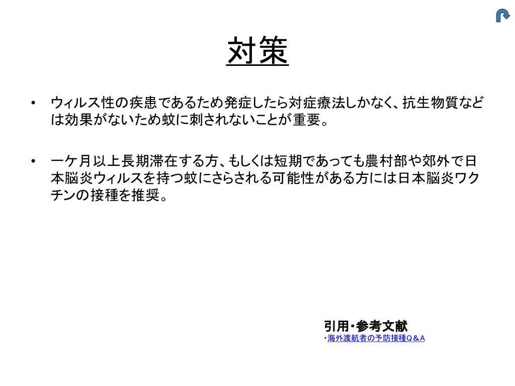 #59. 対策 • ウィルス性の疾患であるため発症したら対症療法しかなく、抗生物質など は効果がないため蚊に刺されないことが重要。 • 一ケ月以上長期滞在する方、もしくは短期であっても農村部や郊外で日 本脳炎ウィルスを持つ蚊にさらされる可能性がある方には日本脳炎ワク チンの接種を推奨。 引用・参考文献 ・海外渡航者の予防接種Q&A