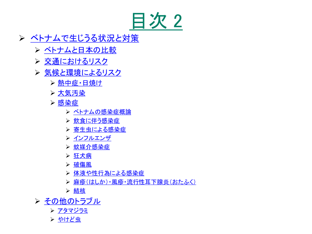 #6. 目次 2 ➢ ベトナムで生じうる状況と対策 ➢ ベトナムと日本の比較 ➢ 交通におけるリスク ➢ 気候と環境によるリスク ➢ 熱中症・日焼け ➢ 大気汚染 ➢ 感染症 ➢ ➢ ➢ ➢ ➢ ➢ ➢ ➢ ➢ ➢ ベトナムの感染症概論 飲食に伴う感染症 寄生虫による感染症 インフルエンザ 蚊媒介感染症 狂犬病 破傷風 体液や性行為による感染症 麻疹(はしか)・風疹・流行性耳下腺炎(おたふく) 結核 ➢ その他のトラブル ➢ アタマジラミ ➢ やけど虫