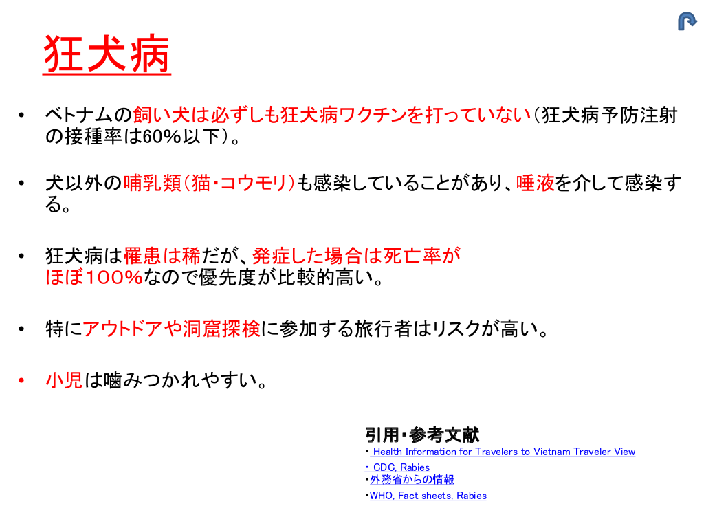 #60. 狂犬病 • ベトナムの飼い犬は必ずしも狂犬病ワクチンを打っていない(狂犬病予防注射 の接種率は60%以下)。 • 犬以外の哺乳類(猫・コウモリ)も感染していることがあり、唾液を介して感染す る。 • 狂犬病は罹患は稀だが、発症した場合は死亡率が ほぼ100%なので優先度が比較的高い。 • 特にアウトドアや洞窟探検に参加する旅行者はリスクが高い。 • 小児は噛みつかれやすい。 引用・参考文献 ・ Health Information for Travelers to Vietnam Traveler View ・ CDC, Rabies ・外務省からの情報 ・WHO, Fact sheets, Rabies