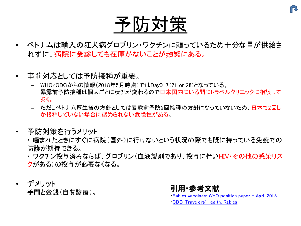 #61. 予防対策 • ベトナムは輸入の狂犬病グロブリン・ワクチンに頼っているため十分な量が供給さ れずに、病院に受診しても在庫がないことが頻繁にある。 • 事前対応としては予防接種が重要。 – – • WHO/CDCからの情報(2018年5月時点)ではDay0, 7,(21 or 28)となっている。 暴露前予防接種は個人ごとに状況が変わるので日本国内にいる間にトラベルクリニックに相談して おく。 ただしベトナム厚生省の方針としては暴露前予防2回接種の方針になっていないため、日本で2回し か接種していない場合に認められない危険性がある。 予防対策を行うメリット ・ 噛まれたときにすぐに病院(国外)に行けないという状況の際でも既に持っている免疫での 防護が期待できる。 ・ ワクチン投与済みならば、グロブリン(血液製剤であり、投与に伴いHIV・その他の感染リス クがある)の投与が必要なくなる。 • デメリット 手間と金銭(自費診療)。 引用・参考文献 ・Rabies vaccines: WHO position paper – April 2018 ・CDC, Travelers' Health, Rabies