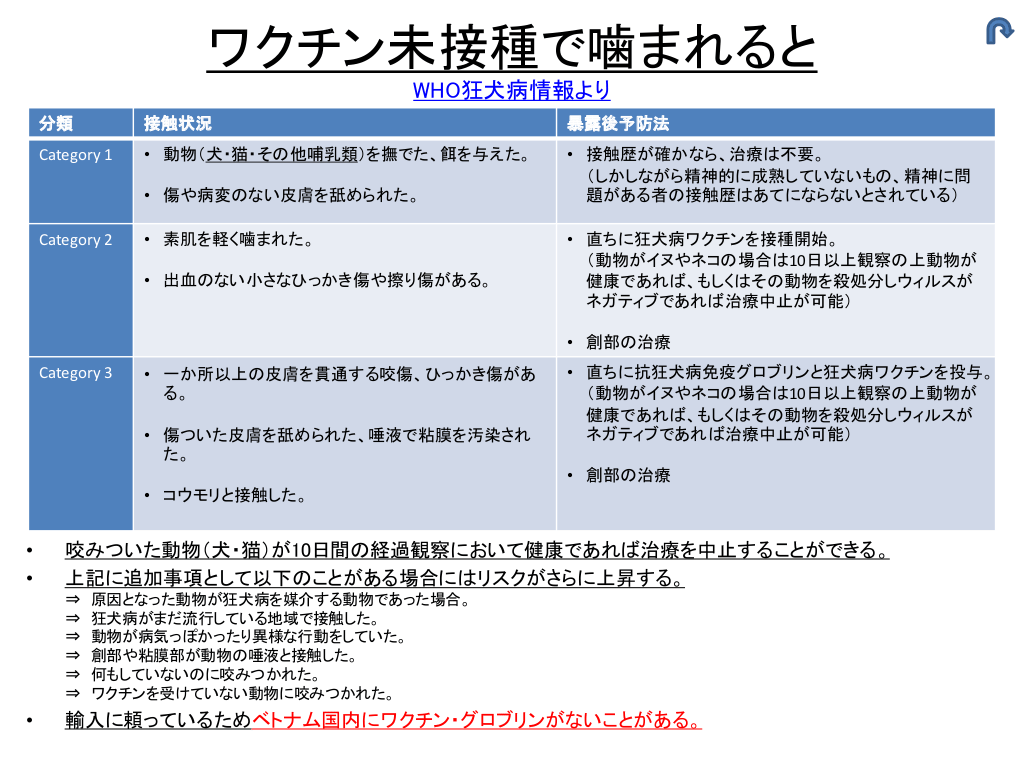 #62. ワクチン未接種で噛まれると WHO狂犬病情報より 分類 接触状況 暴露後予防法 Category 1 • 動物(犬・猫・その他哺乳類)を撫でた、餌を与えた。 • 接触歴が確かなら、治療は不要。 (しかしながら精神的に成熟していないもの、精神に問 題がある者の接触歴はあてにならないとされている) • 傷や病変のない皮膚を舐められた。 Category 2 • 素肌を軽く噛まれた。 • 出血のない小さなひっかき傷や擦り傷がある。 • 直ちに狂犬病ワクチンを接種開始。 (動物がイヌやネコの場合は10日以上観察の上動物が 健康であれば、もしくはその動物を殺処分しウィルスが ネガティブであれば治療中止が可能) • 創部の治療 Category 3 • 一か所以上の皮膚を貫通する咬傷、ひっかき傷があ る。 • 傷ついた皮膚を舐められた、唾液で粘膜を汚染され た。 • 直ちに抗狂犬病免疫グロブリンと狂犬病ワクチンを投与。 (動物がイヌやネコの場合は10日以上観察の上動物が 健康であれば、もしくはその動物を殺処分しウィルスが ネガティブであれば治療中止が可能) • 創部の治療 • コウモリと接触した。 • • 咬みついた動物(犬・猫)が10日間の経過観察において健康であれば治療を中止することができる。 上記に追加事項として以下のことがある場合にはリスクがさらに上昇する。 ⇒ ⇒ ⇒ ⇒ ⇒ ⇒ • 原因となった動物が狂犬病を媒介する動物であった場合。 狂犬病がまだ流行している地域で接触した。 動物が病気っぽかったり異様な行動をしていた。 創部や粘膜部が動物の唾液と接触した。 何もしていないのに咬みつかれた。 ワクチンを受けていない動物に咬みつかれた。 輸入に頼っているためベトナム国内にワクチン・グロブリンがないことがある。
