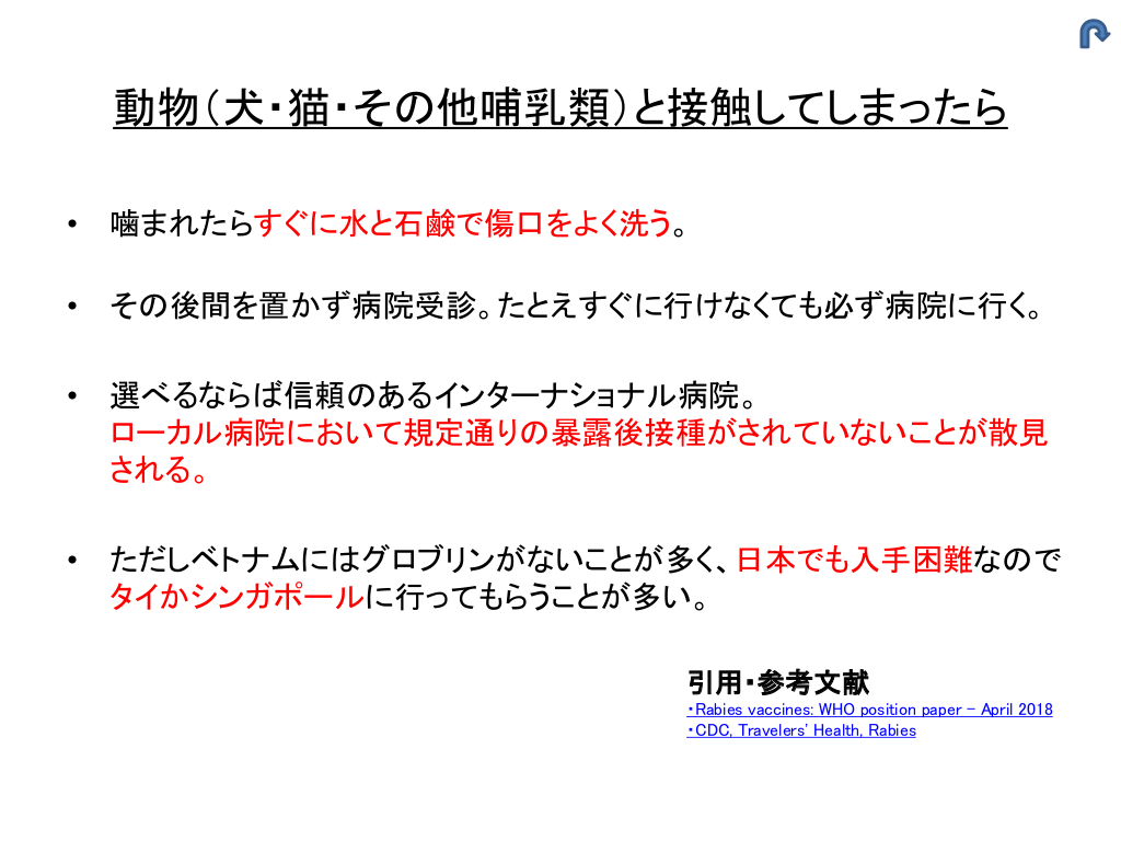 #63. 動物(犬・猫・その他哺乳類)と接触してしまったら • 噛まれたらすぐに水と石鹸で傷口をよく洗う。 • その後間を置かず病院受診。たとえすぐに行けなくても必ず病院に行く。 • 選べるならば信頼のあるインターナショナル病院。 ローカル病院において規定通りの暴露後接種がされていないことが散見 される。 • ただしベトナムにはグロブリンがないことが多く、日本でも入手困難なので タイかシンガポールに行ってもらうことが多い。 引用・参考文献 ・Rabies vaccines: WHO position paper – April 2018 ・CDC, Travelers' Health, Rabies