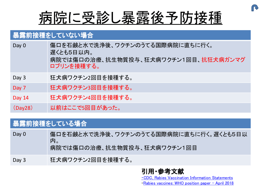 #64. 病院に受診し暴露後予防接種 暴露前接種をしていない場合 Day 0 傷口を石鹸と水で洗浄後、ワクチンのうてる国際病院に直ちに行く。 遅くとも5日以内。 病院では傷口の治療、抗生物質投与、狂犬病ワクチン1回目、抗狂犬病ガンマグ ロブリンを接種する。 Day 3 狂犬病ワクチン2回目を接種する。 Day 7 狂犬病ワクチン3回目を接種する。 Day 14 狂犬病ワクチン4回目を接種する。 (Day28) 以前はここで5回目があった。 暴露前接種をしている場合 Day 0 傷口を石鹸と水で洗浄後、ワクチンのうてる国際病院に直ちに行く。遅くとも5日以 内。 病院では傷口の治療、抗生物質投与、狂犬病ワクチン1回目 Day 3 狂犬病ワクチン2回目を接種する。 引用・参考文献 ・CDC, Rabies Vaccination Information Statements ・Rabies vaccines: WHO position paper – April 2018