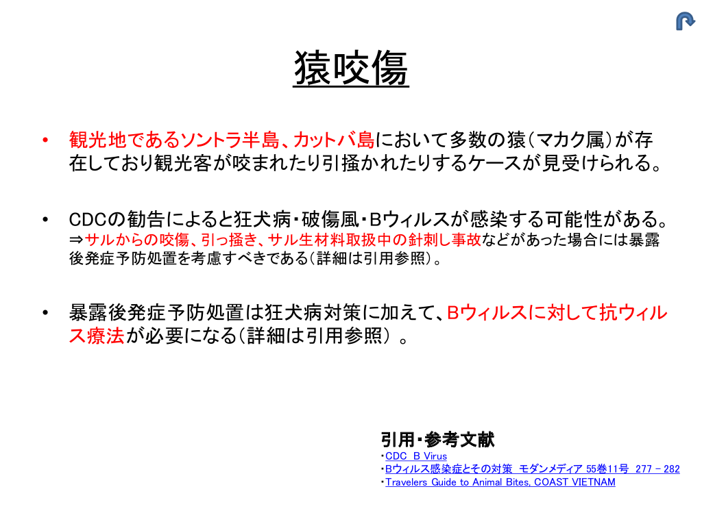 #65. 猿咬傷 • 観光地であるソントラ半島、カットバ島において多数の猿(マカク属)が存 在しており観光客が咬まれたり引掻かれたりするケースが見受けられる。 • CDCの勧告によると狂犬病・破傷風・Bウィルスが感染する可能性がある。 ⇒サルからの咬傷、引っ掻き、サル生材料取扱中の針刺し事故などがあった場合には暴露 後発症予防処置を考慮すべきである(詳細は引用参照)。 • 暴露後発症予防処置は狂犬病対策に加えて、Bウィルスに対して抗ウィル ス療法が必要になる(詳細は引用参照) 。 引用・参考文献 ・CDC B Virus ・Bウィルス感染症とその対策 モダンメディア 55巻11号 277 – 282 ・Travelers Guide to Animal Bites, COAST VIETNAM