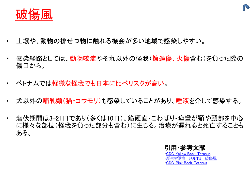 #66. 破傷風 • 土壌や、動物の排せつ物に触れる機会が多い地域で感染しやすい。 • 感染経路としては、動物咬症やそれ以外の怪我(擦過傷、火傷含む)を負った際の 傷口から。 • ベトナムでは軽微な怪我でも日本に比べリスクが高い。 • 犬以外の哺乳類(猫・コウモリ)も感染していることがあり、唾液を介して感染する。 • 潜伏期間は3-21日であり(多くは10日)、筋硬直・こわばり・痙攣が顎や頸部を中心 に様々な部位(怪我を負った部分も含む)に生じる。治療が遅れると死亡することも ある。 引用・参考文献 ・CDC, Yellow Book, Tetanus ・厚生労働省 FORTH 破傷風 ・CDC, Pink Book, Tetanus
