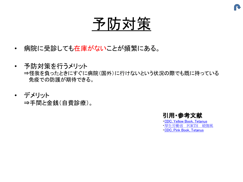 #67. 予防対策 • 病院に受診しても在庫がないことが頻繁にある。 • 予防対策を行うメリット ⇒怪我を負ったときにすぐに病院(国外)に行けないという状況の際でも既に持っている 免疫での防護が期待できる。 • デメリット ⇒手間と金銭(自費診療)。 引用・参考文献 ・CDC, Yellow Book, Tetanus ・厚生労働省 FORTH 破傷風 ・CDC, Pink Book, Tetanus