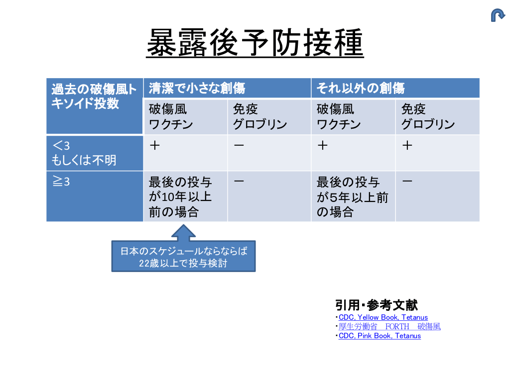 #68. 暴露後予防接種 過去の破傷風ト 清潔で小さな創傷 キソイド投数 破傷風 免疫 ワクチン グロブリン それ以外の創傷 破傷風 ワクチン 免疫 グロブリン <3 もしくは不明 + - + + ≧3 最後の投与 が10年以上 前の場合 - - 最後の投与 が5年以上前 の場合 日本のスケジュールならならば 22歳以上で投与検討 引用・参考文献 ・CDC, Yellow Book, Tetanus ・厚生労働省 FORTH 破傷風 ・CDC, Pink Book, Tetanus
