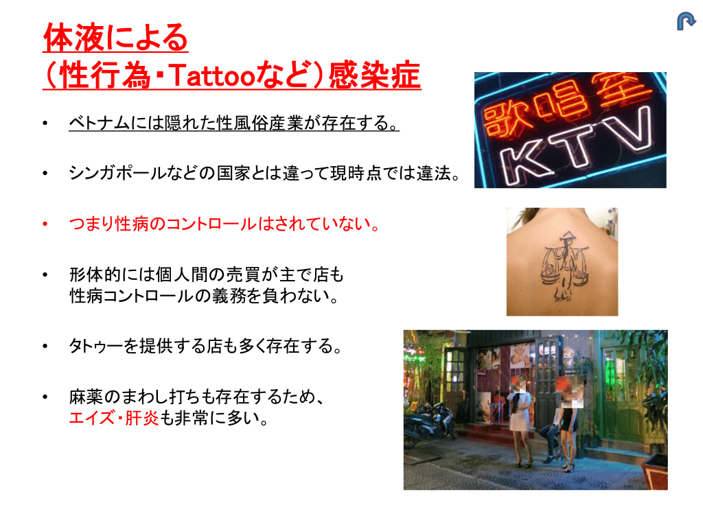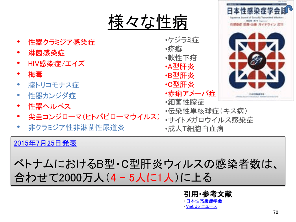 #69. 体液による (性行為・Tattooなど)感染症 • ベトナムには隠れた性風俗産業が存在する。 • シンガポールなどの国家とは違って現時点では違法。 • つまり性病のコントロールはされていない。 • 形体的には個人間の売買が主で店も 性病コントロールの義務を負わない。 • タトゥーを提供する店も多く存在する。 • 麻薬のまわし打ちも存在するため、 エイズ・肝炎も非常に多い。