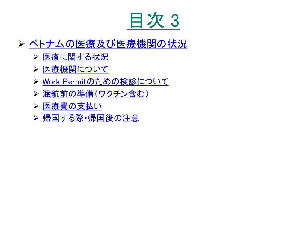 #2. • 趣旨 これまでの経験を通して得た海外、特にベトナムに関する医学的情報を現在・未来に活躍 する日本人医療者、海外人事担当者の方たちと共有するとともに、ベトナム邦人社会のさ らなる発展の一助になることを祈念して公開いたします。 今回の掲載にあたっては可能な限り情報が網羅的かつ公平なものになること、情報発信・ Updateの永続性を保つことを考慮して、あえて私が総合診療医として所属するRaffles HCMC Clinicではなく今回の意図にご賛同いただきましたYOKOYAMA KAIKEI GROUP 様および、私が医療産業に関するコンサルタントとして所属するClover Plus Co.,Ltdのホ ームページ内を使用させていただいています。 • 免責事項 ここで扱われている医療情報は、情報伝達目的で掲載されたものであり、必ずしも確立され たものばかりではありません。いまだ研究段階のものも含まれています。情報の選別には 細心の注意を払い参照元も掲載するように致してておりますが、掲載されている情報によっ て起こったいかなる結果に対しても一切責任は負えませんことをお断りいたします。 • 謝辞 今回この医療情報を公開するにあたり、JAMSNET東京を通じて外務省診療所所長 仲本 光一先生と在パプアニューギニア日本国大使館 参事官兼医務官 吉田常孝先生に多大 なご協力をいただきました。また掲載にあたっては株式会社 YOKOYAMA KAIKEI GROUP 横山 和寿氏、Clover Plus 佐々木英樹氏・山形守人氏に寛大なお心遣いをい ただきました。 心より感謝申し上げます。 © 2018 医療産業アドバイザー 中島 敏彦