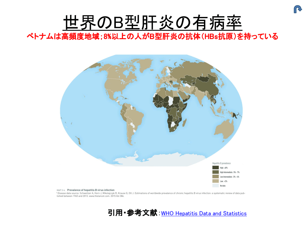 #71. 世界のB型肝炎の有病率 ベトナムは高頻度地域;8%以上の人がB型肝炎の抗体(HBs抗原)を持っている 引用・参考文献:WHO Hepatitis Data and Statistics