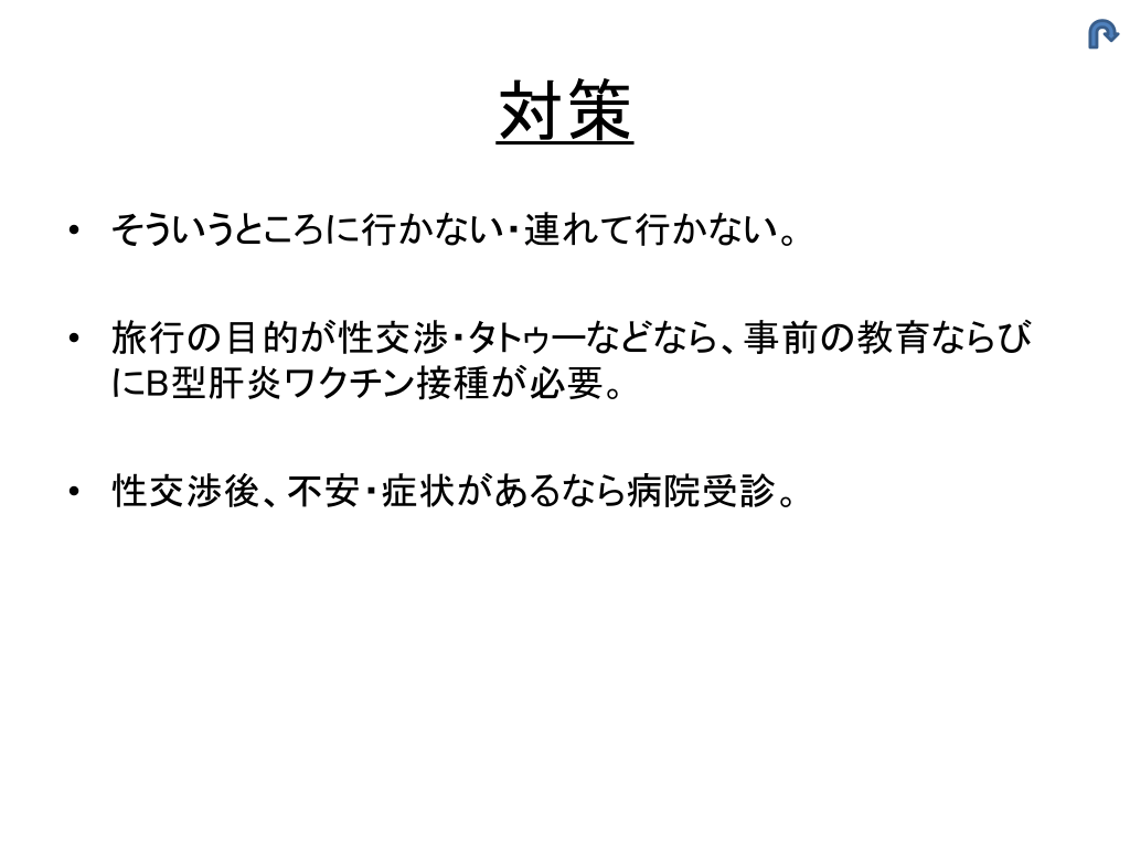 #72. 対策 • そういうところに行かない・連れて行かない。 • 旅行の目的が性交渉・タトゥーなどなら、事前の教育ならび にB型肝炎ワクチン接種が必要。 • 性交渉後、不安・症状があるなら病院受診。