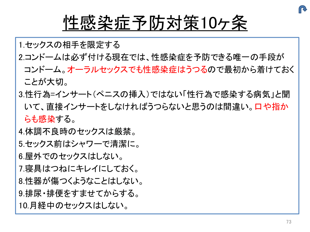 #73. 性感染症予防対策10ヶ条 1.セックスの相手を限定する 2.コンドームは必ず付ける現在では、性感染症を予防できる唯一の手段が コンドーム。オーラルセックスでも性感染症はうつるので最初から着けておく ことが大切。 3.性行為=インサート(ペニスの挿入)ではない「性行為で感染する病気」と聞 いて、直接インサートをしなければうつらないと思うのは間違い。口や指か らも感染する。 4.体調不良時のセックスは厳禁。 5.セックス前はシャワーで清潔に。 6.屋外でのセックスはしない。 7.寝具はつねにキレイにしておく。 8.性器が傷つくようなことはしない。 9.排尿・排便をすませてからする。 10.月経中のセックスはしない。 73