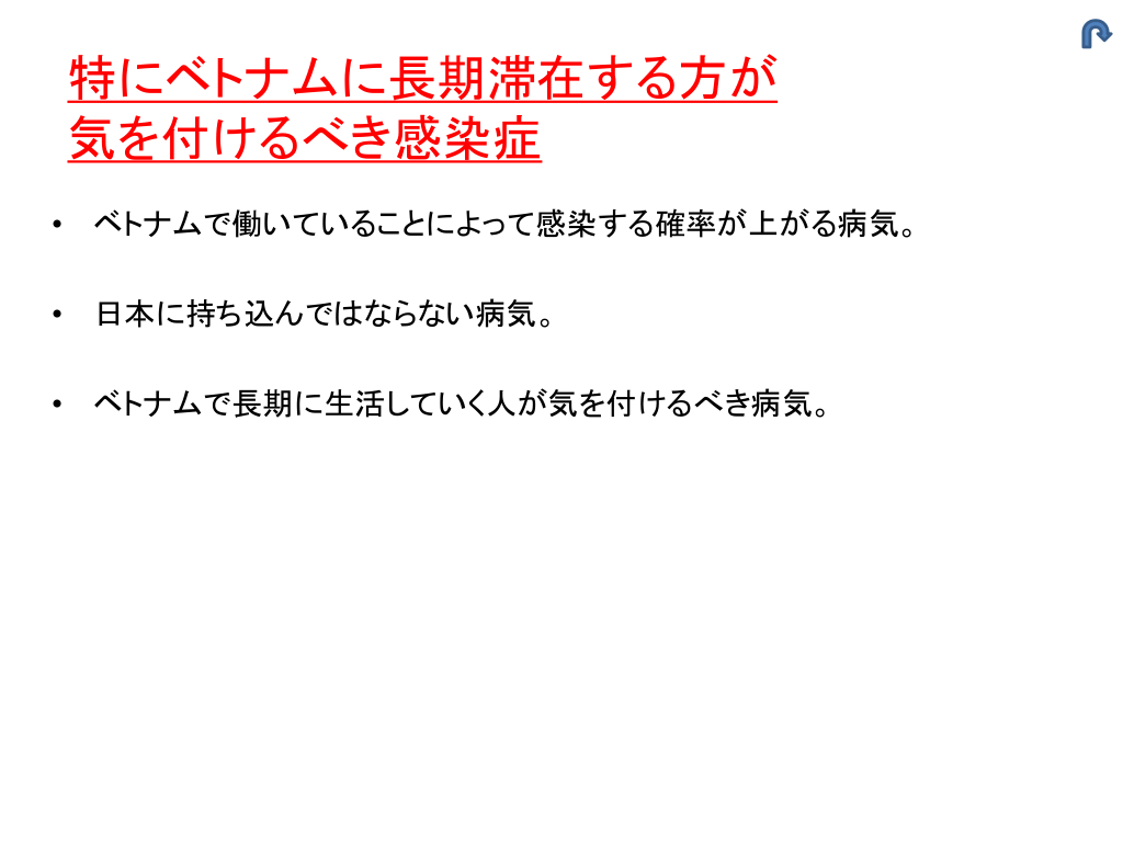 #74. 特にベトナムに長期滞在する方が 気を付けるべき感染症 • ベトナムで働いていることによって感染する確率が上がる病気。 • 日本に持ち込んではならない病気。 • ベトナムで長期に生活していく人が気を付けるべき病気。