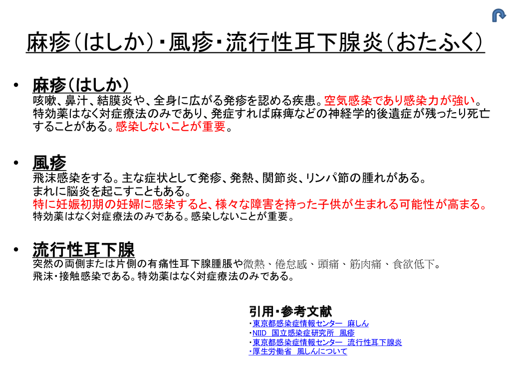#75. 麻疹(はしか)・風疹・流行性耳下腺炎(おたふく) • 麻疹(はしか) 咳嗽、鼻汁、結膜炎や、全身に広がる発疹を認める疾患。空気感染であり感染力が強い。 特効薬はなく対症療法のみであり、発症すれば麻痺などの神経学的後遺症が残ったり死亡 することがある。感染しないことが重要。 • 風疹 飛沫感染をする。主な症状として発疹、発熱、関節炎、リンパ節の腫れがある。 まれに脳炎を起こすこともある。 特に妊娠初期の妊婦に感染すると、様々な障害を持った子供が生まれる可能性が高まる。 特効薬はなく対症療法のみである。感染しないことが重要。 • 流行性耳下腺 突然の両側または片側の有痛性耳下腺腫脹や微熱、倦怠感、頭痛、筋肉痛、食欲低下。 飛沫・接触感染である。特効薬はなく対症療法のみである。 引用・参考文献 ・東京都感染症情報センター 麻しん ・NIID 国立感染症研究所 風疹 ・東京都感染症情報センター 流行性耳下腺炎 ・厚生労働省 風しんについて