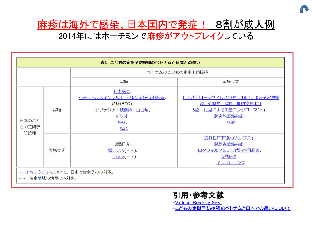 #76. 麻疹は海外で感染、日本国内で発症! 8割が成人例 2014年にはホーチミンで麻疹がアウトブレイクしている 引用・参考文献 ・Vietnam Breaking News ・こどもの定期予防接種のベトナムと日本との違いについて