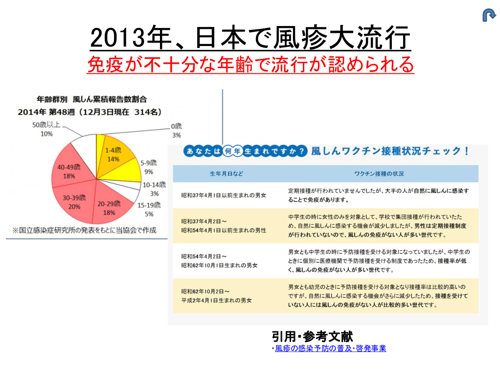 #78. 2013年、日本で風疹大流行 免疫が不十分な年齢で流行が認められる 引用・参考文献 ・風疹の感染予防の普及・啓発事業