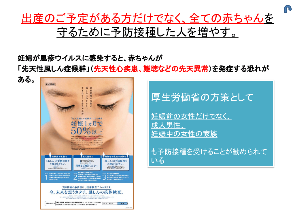 #79. 出産のご予定がある方だけでなく、全ての赤ちゃんを 守るために予防接種した人を増やす。 妊婦が風疹ウイルスに感染すると、赤ちゃんが 「先天性風しん症候群」(先天性心疾患、難聴などの先天異常)を発症する恐れが ある。 厚生労働省の方策として 妊娠前の女性だけでなく、 成人男性、 妊娠中の女性の家族 も予防接種を受けることが勧められて いる