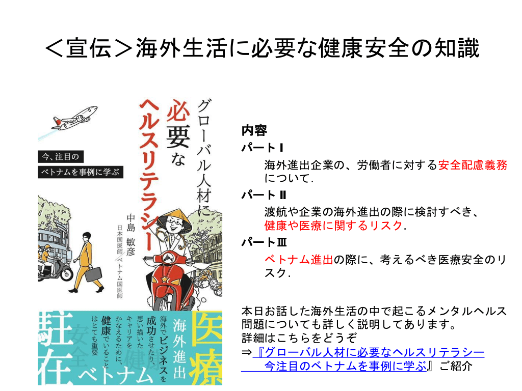 #8. <宣伝>海外生活に必要な健康安全の知識 内容 パート I 海外進出企業の、労働者に対する安全配慮義務 について. パート II 渡航や企業の海外進出の際に検討すべき、 健康や医療に関するリスク. パートⅢ ベトナム進出の際に、考えるべき医療安全のリ スク. 本日お話した海外生活の中で起こるメンタルヘルス 問題についても詳しく説明してあります。 詳細はこちらをどうぞ ⇒『グローバル人材に必要なヘルスリテラシー 今注目のベトナムを事例に学ぶ』ご紹介