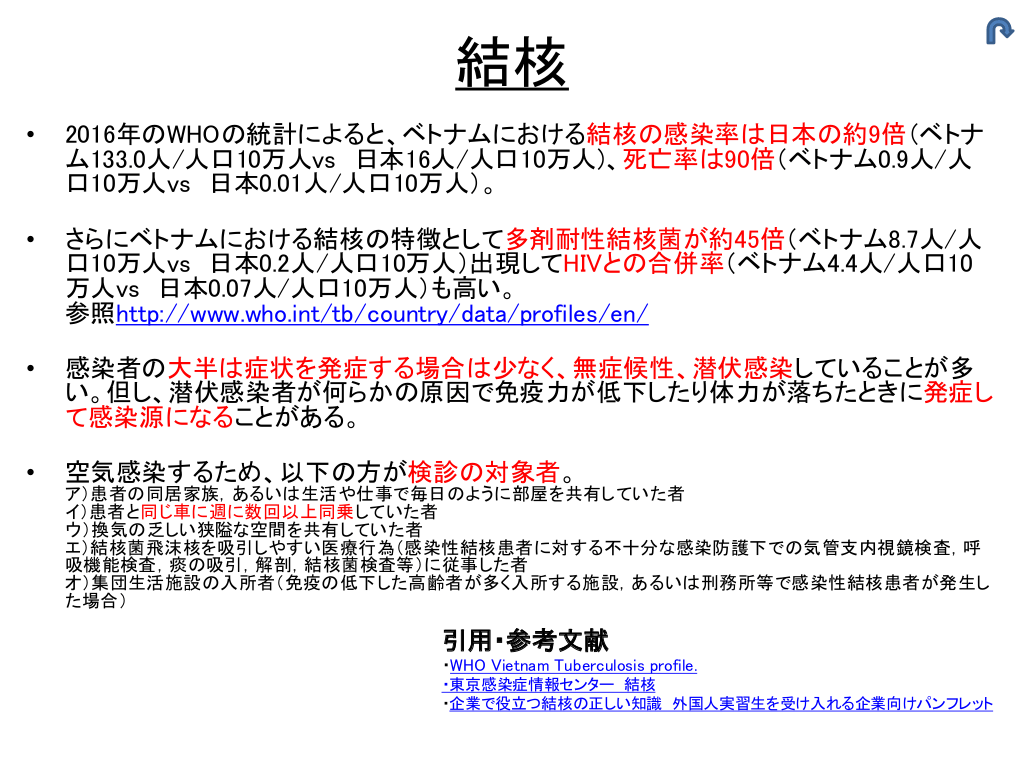 #80. 結核 • 2016年のWHOの統計によると、ベトナムにおける結核の感染率は日本の約9倍(ベトナ ム133.0人/人口10万人vs 日本16人/人口10万人)、死亡率は90倍(ベトナム0.9人/人 口10万人vs 日本0.01人/人口10万人)。 • さらにベトナムにおける結核の特徴として多剤耐性結核菌が約45倍(ベトナム8.7人/人 口10万人vs 日本0.2人/人口10万人)出現してHIVとの合併率(ベトナム4.4人/人口10 万人vs 日本0.07人/人口10万人)も高い。 参照http://www.who.int/tb/country/data/profiles/en/ • 感染者の大半は症状を発症する場合は少なく、無症候性、潜伏感染していることが多 い。但し、潜伏感染者が何らかの原因で免疫力が低下したり体力が落ちたときに発症し て感染源になることがある。 • 空気感染するため、以下の方が検診の対象者。 ア)患者の同居家族,あるいは生活や仕事で毎日のように部屋を共有していた者 イ)患者と同じ車に週に数回以上同乗していた者 ウ)換気の乏しい狭隘な空間を共有していた者 エ)結核菌飛沫核を吸引しやすい医療行為(感染性結核患者に対する不十分な感染防護下での気管支内視鏡検査,呼 吸機能検査,痰の吸引,解剖,結核菌検査等)に従事した者 オ)集団生活施設の入所者(免疫の低下した高齢者が多く入所する施設,あるいは刑務所等で感染性結核患者が発生し た場合) 引用・参考文献 ・WHO Vietnam Tuberculosis profile. ・東京感染症情報センター 結核 ・企業で役立つ結核の正しい知識 外国人実習生を受け入れる企業向けパンフレット
