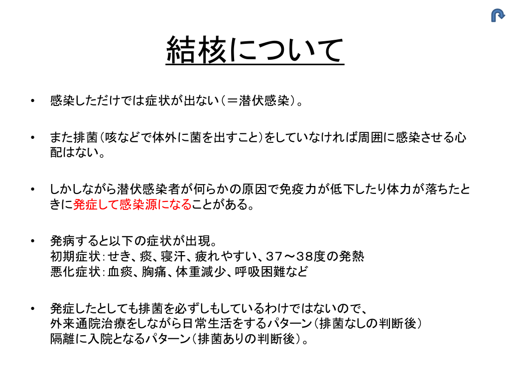 #81. 結核について • 感染しただけでは症状が出ない(=潜伏感染)。 • また排菌(咳などで体外に菌を出すこと)をしていなければ周囲に感染させる心 配はない。 • しかしながら潜伏感染者が何らかの原因で免疫力が低下したり体力が落ちたと きに発症して感染源になることがある。 • 発病すると以下の症状が出現。 初期症状:せき、痰、寝汗、疲れやすい、37~38度の発熱 悪化症状:血痰、胸痛、体重減少、呼吸困難など • 発症したとしても排菌を必ずしもしているわけではないので、 外来通院治療をしながら日常生活をするパターン(排菌なしの判断後) 隔離に入院となるパターン(排菌ありの判断後)。