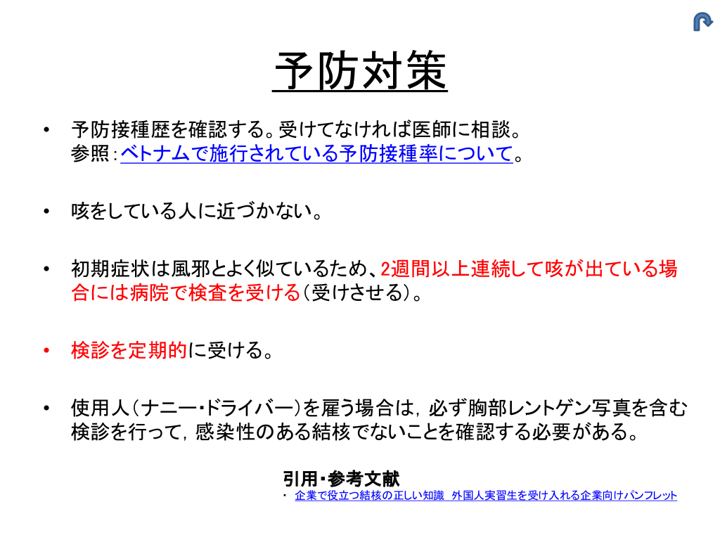 #82. 予防対策 • 予防接種歴を確認する。受けてなければ医師に相談。 参照:ベトナムで施行されている予防接種率について。 • 咳をしている人に近づかない。 • 初期症状は風邪とよく似ているため、2週間以上連続して咳が出ている場 合には病院で検査を受ける(受けさせる)。 • 検診を定期的に受ける。 • 使用人(ナニー・ドライバー)を雇う場合は,必ず胸部レントゲン写真を含む 検診を行って,感染性のある結核でないことを確認する必要がある。 引用・参考文献 ・ 企業で役立つ結核の正しい知識 外国人実習生を受け入れる企業向けパンフレット