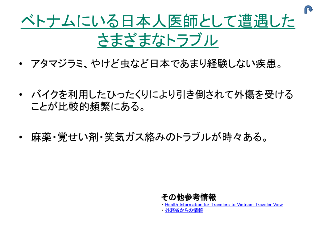 #83. ベトナムにいる日本人医師として遭遇した さまざまなトラブル • アタマジラミ、やけど虫など日本であまり経験しない疾患。 • バイクを利用したひったくりにより引き倒されて外傷を受ける ことが比較的頻繁にある。 • 麻薬・覚せい剤・笑気ガス絡みのトラブルが時々ある。 その他参考情報 ・ Health Information for Travelers to Vietnam Traveler View ・ 外務省からの情報