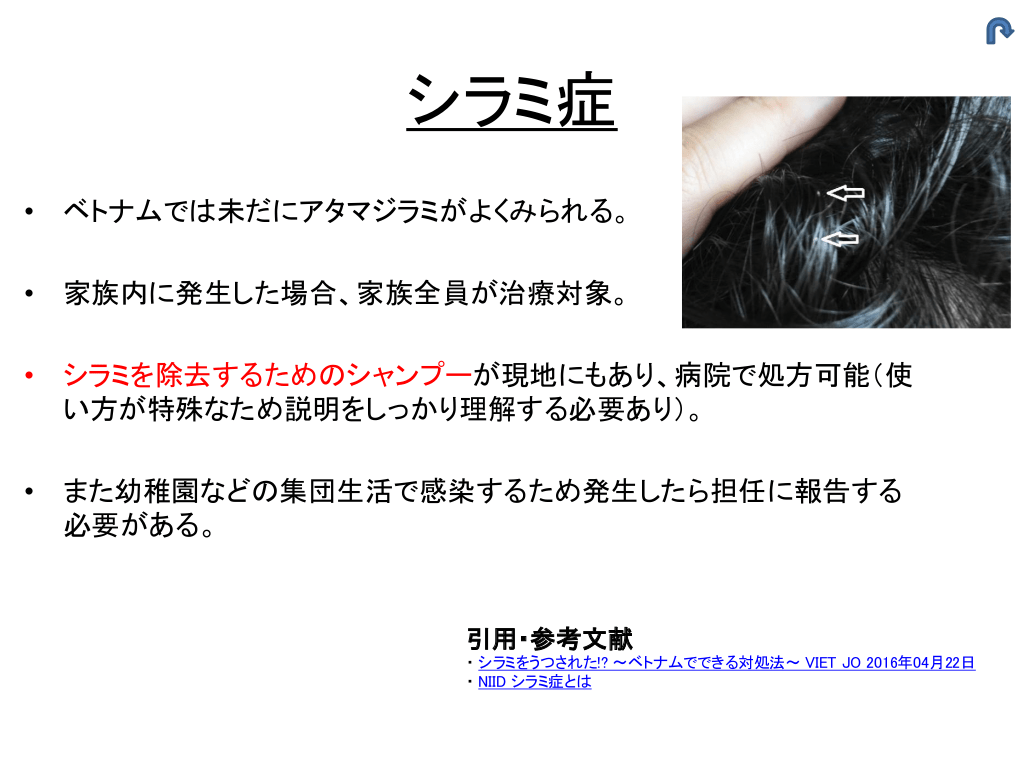#84. シラミ症 • ベトナムでは未だにアタマジラミがよくみられる。 • 家族内に発生した場合、家族全員が治療対象。 • シラミを除去するためのシャンプーが現地にもあり、病院で処方可能(使 い方が特殊なため説明をしっかり理解する必要あり)。 • また幼稚園などの集団生活で感染するため発生したら担任に報告する 必要がある。 引用・参考文献 ・ シラミをうつされた!? ~ベトナムでできる対処法~ VIET JO 2016年04月22日 ・ NIID シラミ症とは