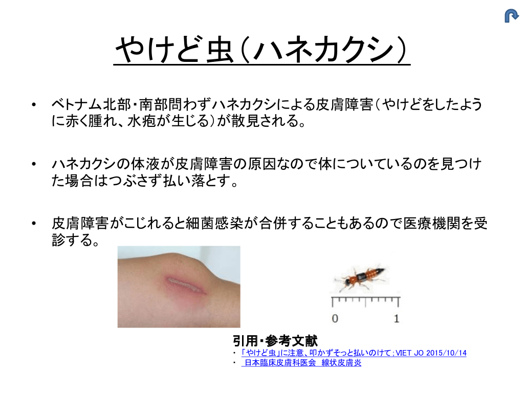 #85. やけど虫(ハネカクシ) • ベトナム北部・南部問わずハネカクシによる皮膚障害(やけどをしたよう に赤く腫れ、水疱が生じる)が散見される。 • ハネカクシの体液が皮膚障害の原因なので体についているのを見つけ た場合はつぶさず払い落とす。 • 皮膚障害がこじれると細菌感染が合併することもあるので医療機関を受 診する。 引用・参考文献 ・ 「やけど虫」に注意、叩かずそっと払いのけて;VIET JO 2015/10/14 ・ 日本臨床皮膚科医会 線状皮膚炎