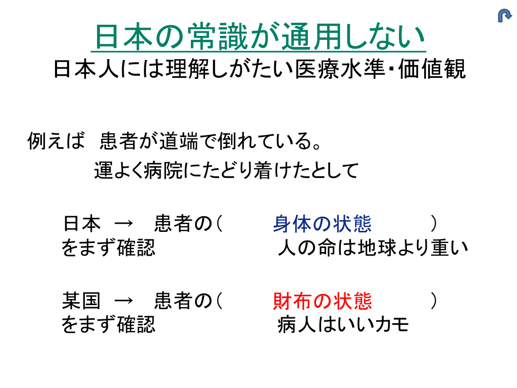 #87. 日本の常識が通用しない 日本人には理解しがたい医療水準・価値観 例えば 患者が道端で倒れている。 運よく病院にたどり着けたとして 87 日本 → 患者の( をまず確認 ) 身体の状態 人の命は地球より重い 某国 → 患者の( をまず確認 ) 財布の状態 病人はいいカモ